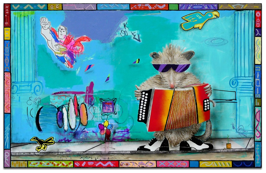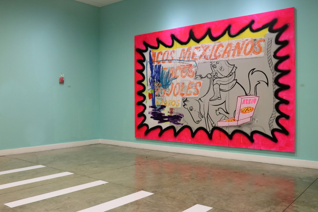 “His pop culture references evoke a sense of familiarity for the audience, and he is very generous with his wit. There elements ensure that other, more personal, themes of home, of belonging, of memory stay with us” – by Cristina Frasier, lives in San Antonio, studies hand painted signs, & currently a PHD candidate in anthropology