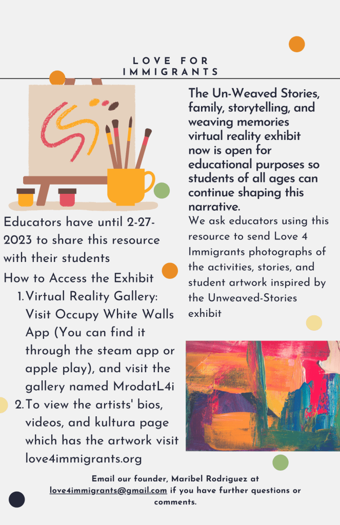 The Un-Weaved Stories, family, storytelling, and weaving memories virtual reality exhibit now is open for educational purposes so students of all ages can continue shaping this narrative. Whether the learning is about understanding more profoundly the stories of immigrants and refugees, or whether it is about how to use art as a tool for social change, self-expression or whether the course is about anthropology and the importance of storytelling, or if the discussion is about technology like virtual reality making artistic visions come to fruition in an online world. All artists generously allow Love 4 Immigrants to share the exhibit and their artwork for a year.