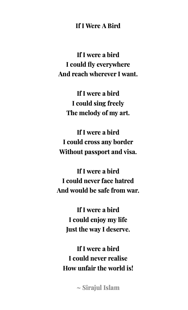 Sirajul’s Book is available for purchase now: If I Were a Bird: A Voice of Resilience
