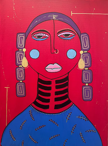 painting features a woman with long purple hair and striking gold earrings, her stoic expression